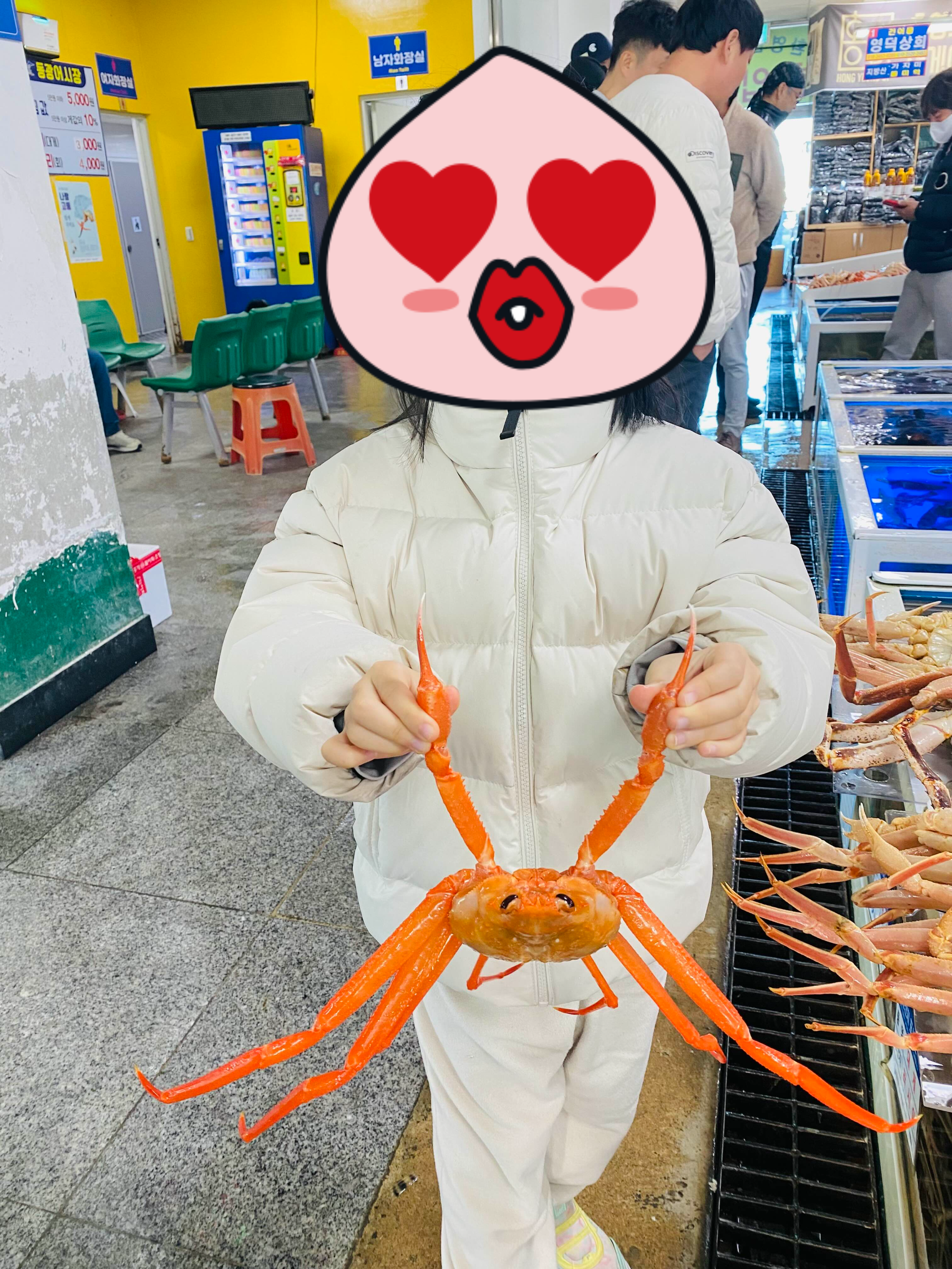 시장에서 대게 고를때 친절하신 사장님이 아이와함께 사진 찍으라고 하셔서 홍게 들고 사진도 찍어주었네요.