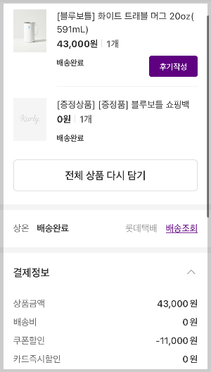 마켓컬리를 통해 구입했구요. 정상가에서 할인 받아서 3만3천원에 구입했어요. 마켓컬리는 신규가입또는 가입후 구매하지 않고 묵혀두면 할인쿠폰을 뿌려요. 할인쿠폰 금액이 클때 구입하면 블루보틀 텀블러나 머그컵 알뜰하게 구입가능해요.